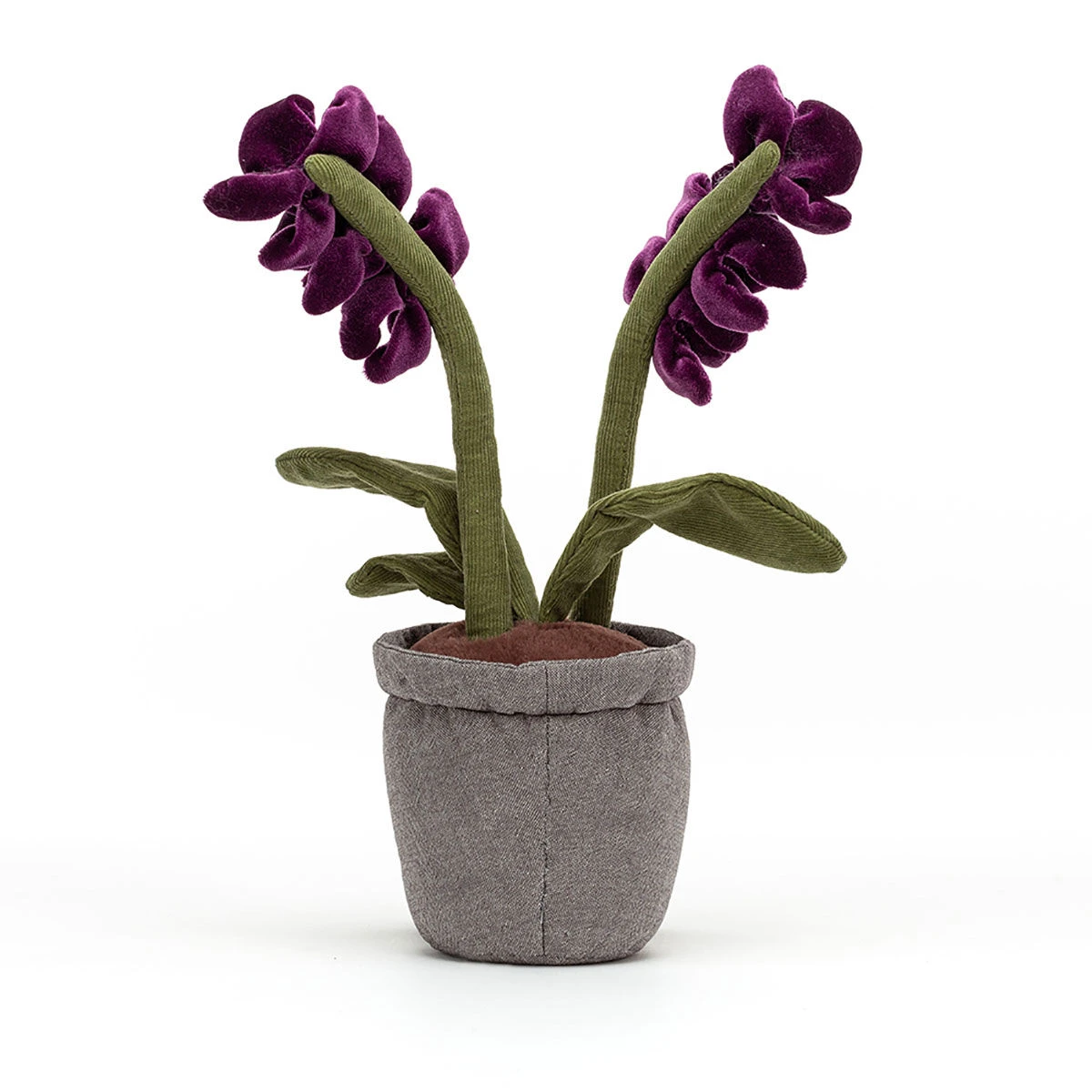 Say hello to this blooming gorgeous Amuseable Orchid! With soft cordy leaves, fluffy earthy brown hair and a cheery little face, her plant pot body is filled with beans so she can sit upright, with two little brown corduroy legs poking out at the bottom. Her rich purple flowers with bright orange stamens are dangling from 2 stems curving in both directions and are silky soft!