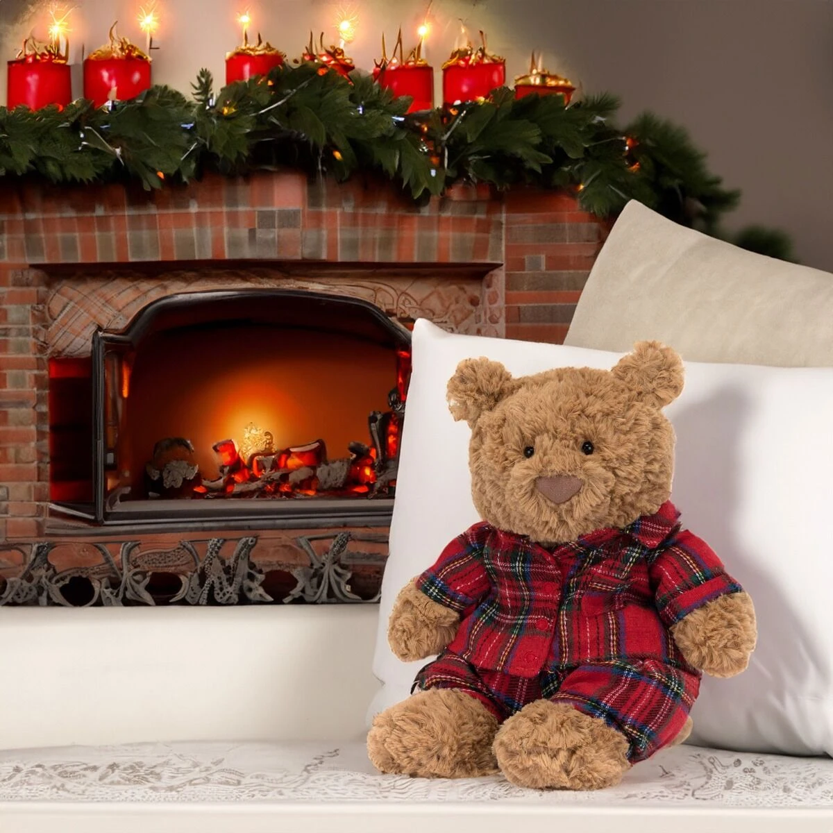 This velvety brown bear has soft fur that is very strokable. He has a very squishy tummy that is perfect for snuggling up with. He is dressed in adorable red chequered pyjamas and has twinkling eyes that are full of festive cheer and a fuzzy brown nose.