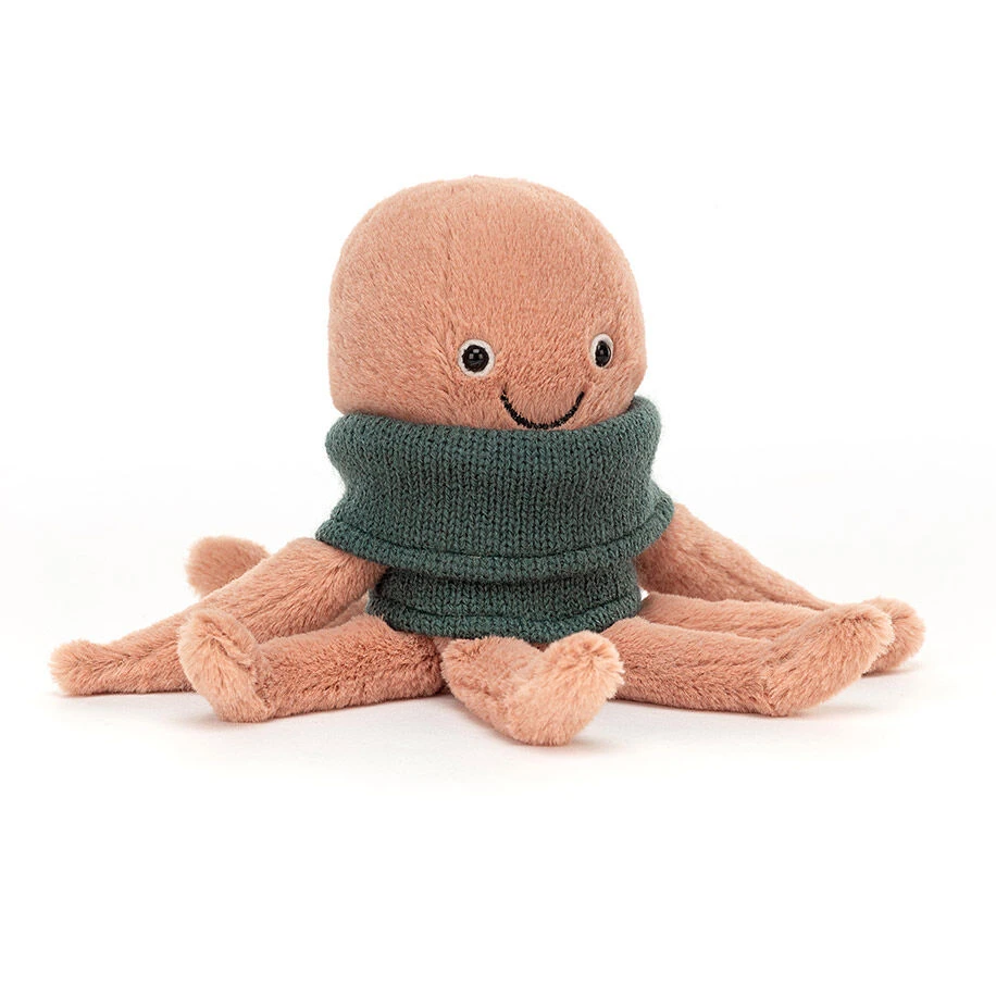 Say hello to the cutest little octopus you’re ever likely to meet. Cozy Crew Octopus wears a knitted green turtleneck jumper, perfect for keeping him warm on those chilly evenings amongst the ocean waves.