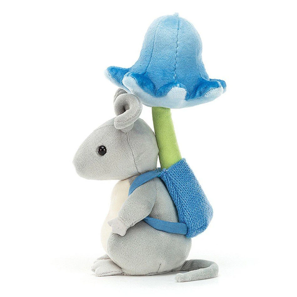 This charming little rodent is ever so soft with strokable grey fur, a cream tummy, silky ears, and a long tail. She is carrying a gorgeous bluebell flower on her back.