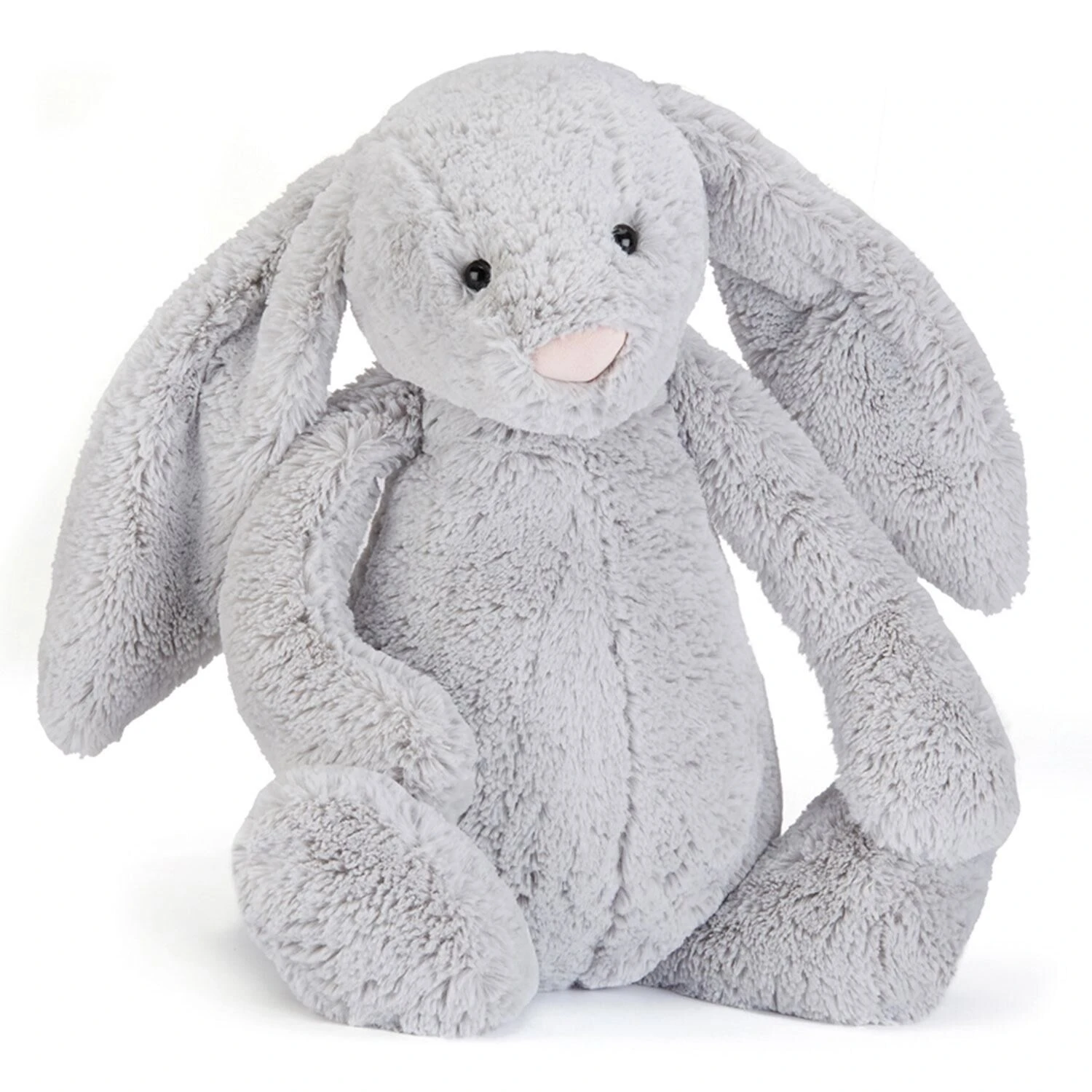 He has beautifully delicate silver coloured fur, a cute pink nose and strokable soft fur. This Bashful Huge bunny also has a few plastic beans in his bottom, which enables him to sit up on his own on a chair by the bed while your little one sleeps.