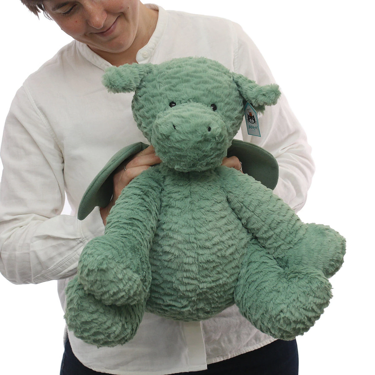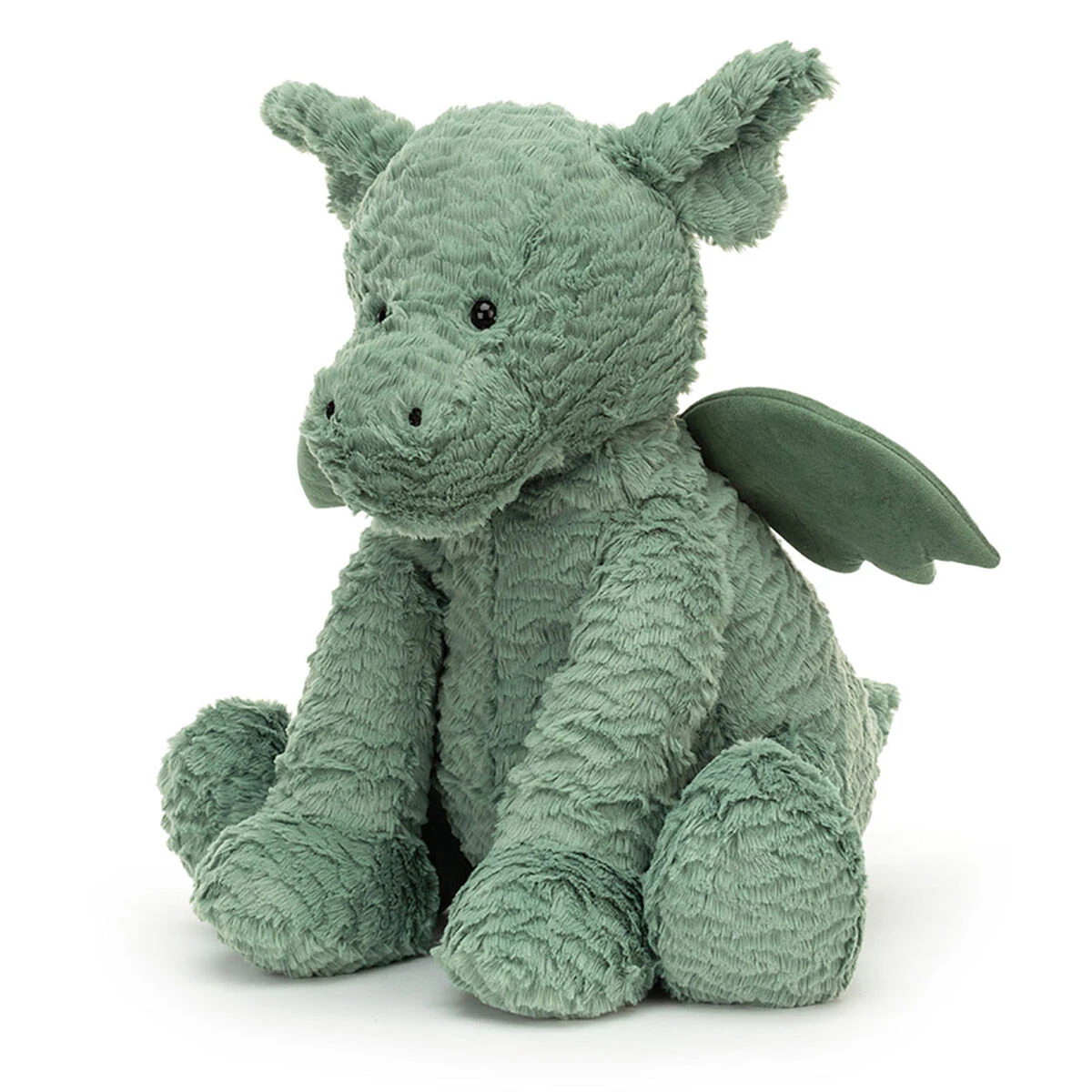 This cute green dragon has fuzzy fur which makes him irresistibly soft and cuddly. He has sticky out ears, an adorable face, and a little pointy tail. No dragon is complete without his flappy wings which are velvety soft! He even sits upright thanks to beans in his bottom meaning he can sit on your shelf or beside table when you’re not playing with him.