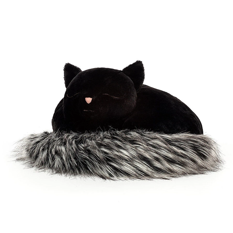 With a cushioned body that is plump, suedey, and soft, this gorgeous black kitty has sleepy eyes, pricked ears, and an adorable face that you can’t help but fall in love with. She comes with very fleecy wraparound tail that she snuggles up with.