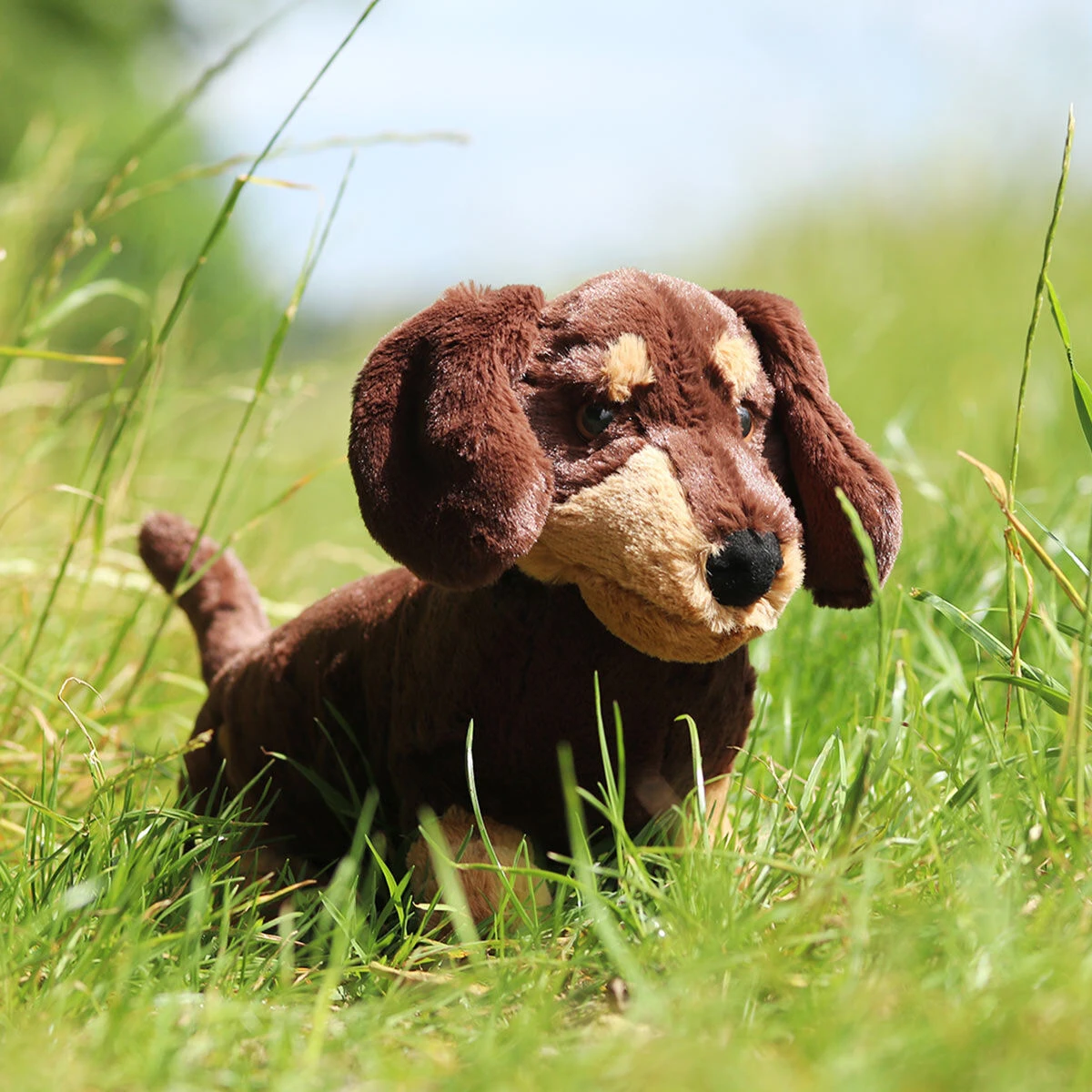 He has chocolate brown coloured fur, with a toffee-coloured snout and diddy doggy paws! He holds his tail in the air, with twinkling eyes to find the best places for you both to play! His squidgy sausage-shaped body and snuggly fur make him the perfect bedtime companion as you drift off, dreaming of the adventures you’ll have together. Â