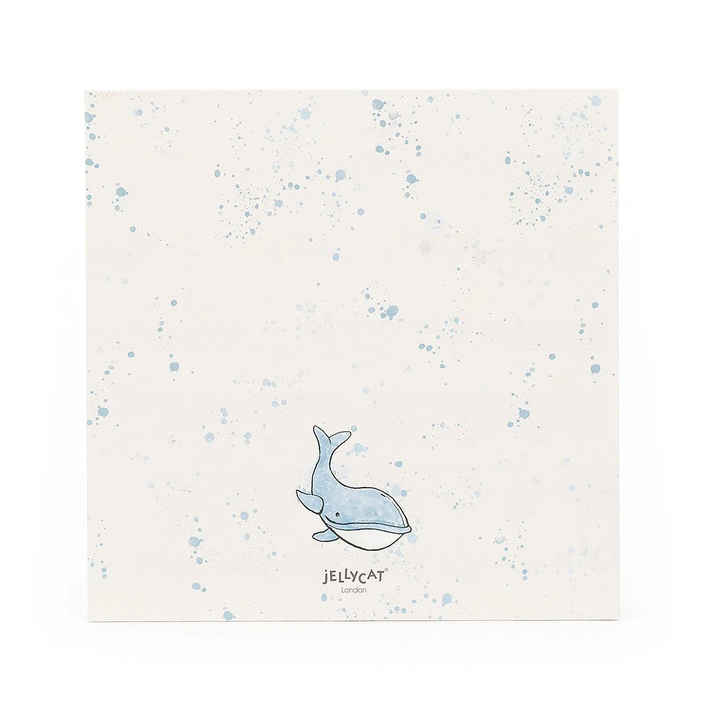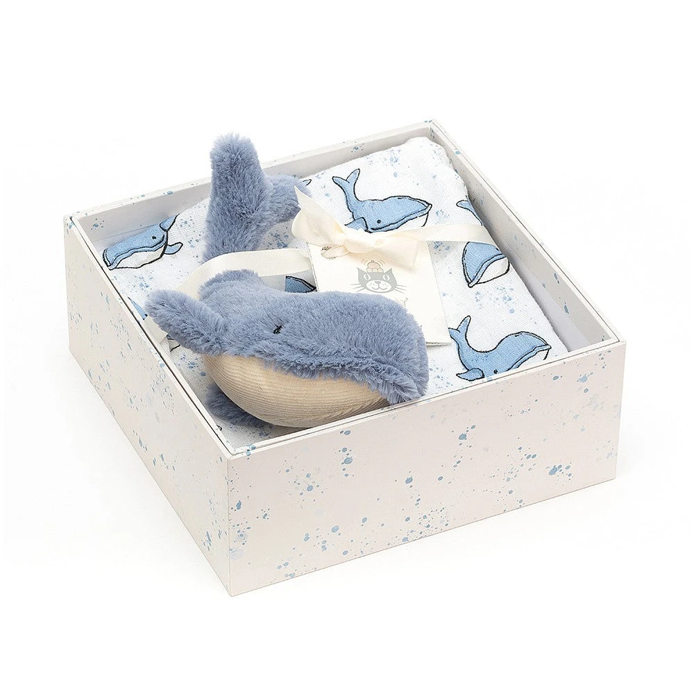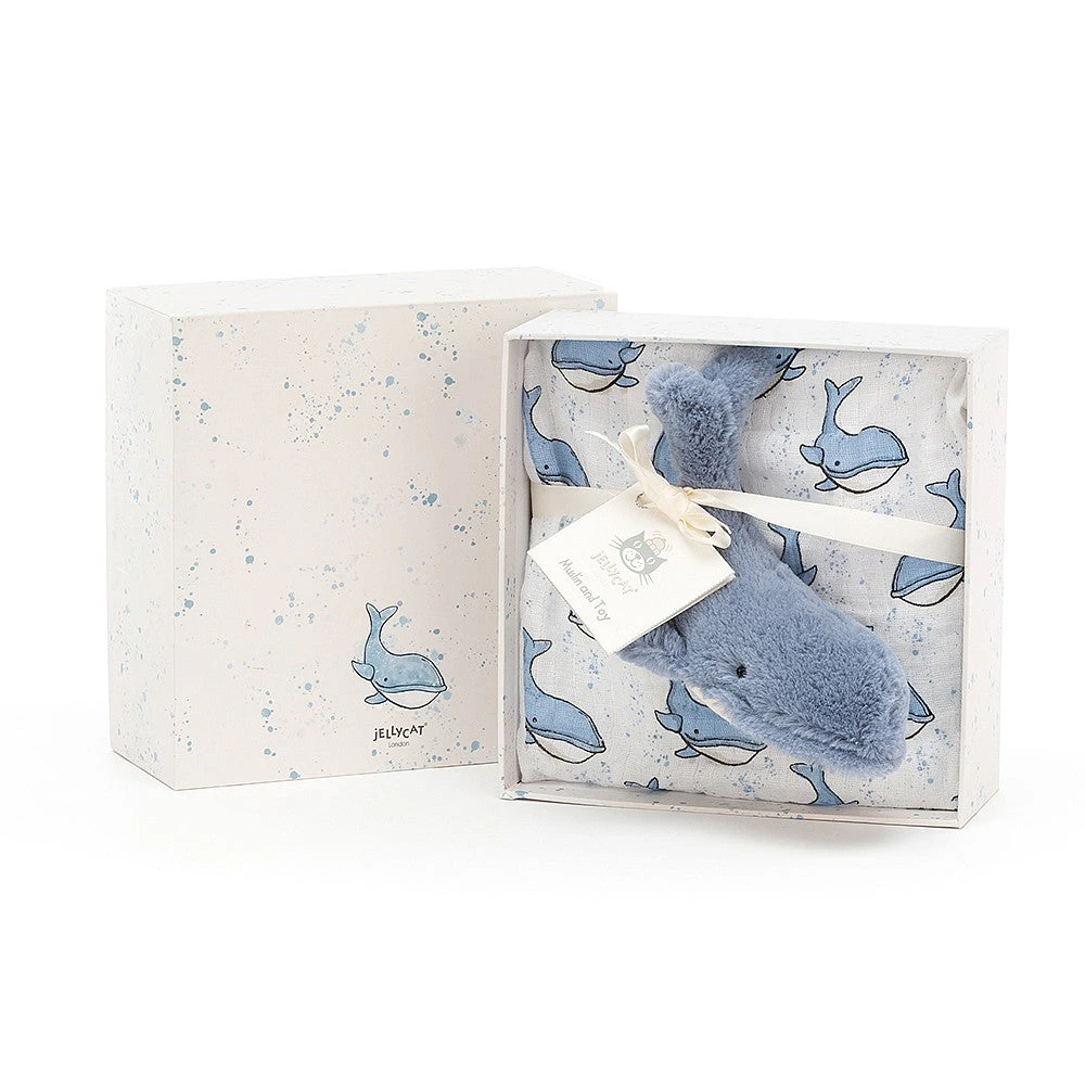 Tucked inside this gorgeous print box is the Wilbur Whale Gift Set! Featuring our bouncy blue whale, with his creamy cordy tum, it also contains a print muslin made of 100% cotton. A beautiful birthday or welcome-home gift.